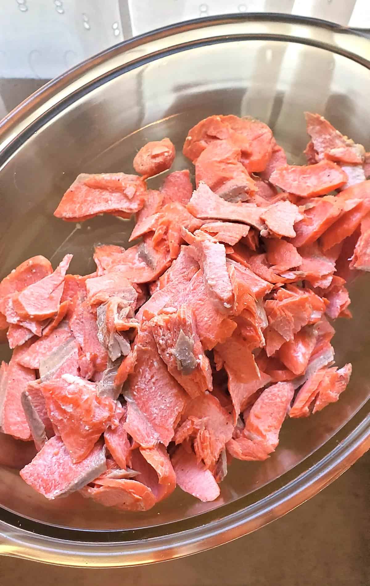 - While the pasta is cooking, use two forks to shred the cooled salmon fillets into bite-sized pieces.