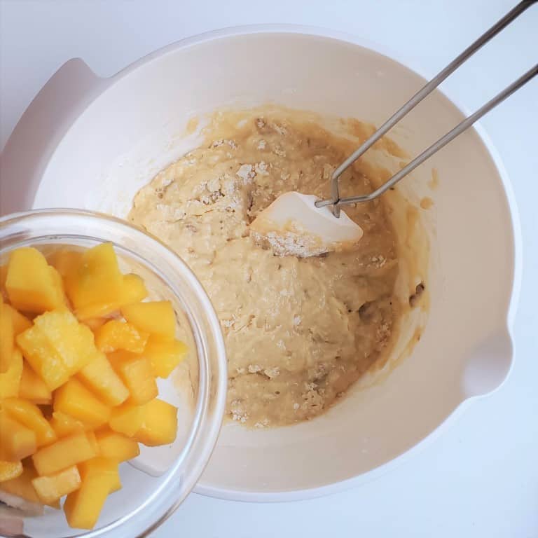Once the dry ingredients have been well incorporated into the mixture, lastly, add in the chopped pears and mango and gently fold into the batter.